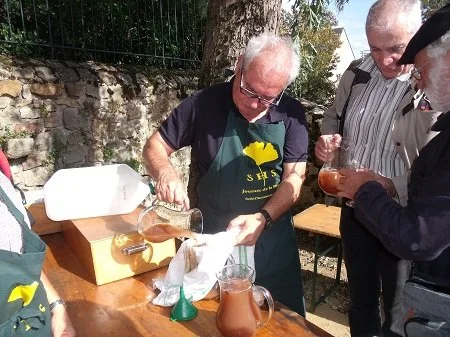 M. Breux, maire-adjoint, filtre le jus précieux par un torchon
