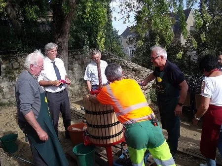 Pressurage des raisins sous l’oeil attentif de M. le Maire.